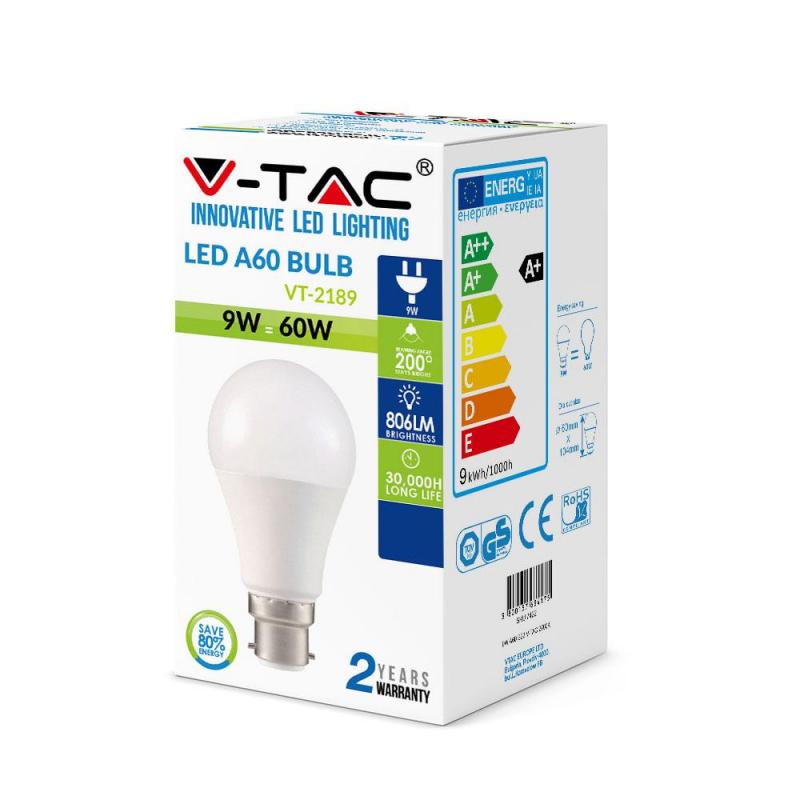 Żarówka LED V-TAC VT-2189 9W B22 A60 2700K 806lm A+ 200°