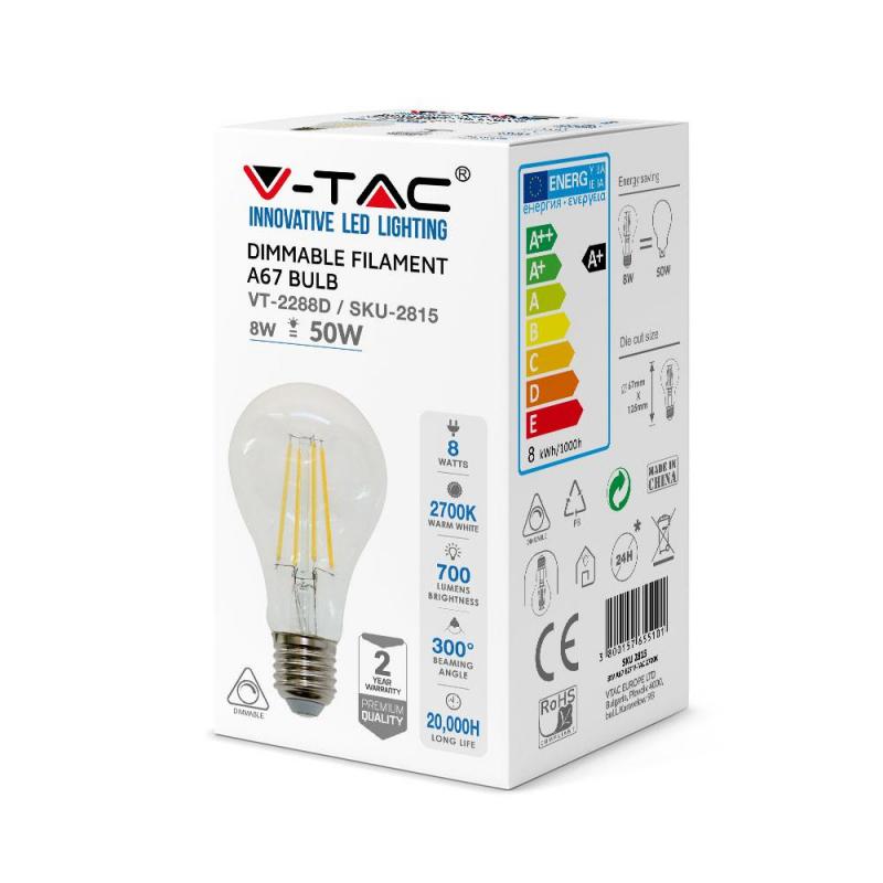 Żarówka LED V-TAC VT-2288D 8W E27 A67 2700K 700lm A+ 300°