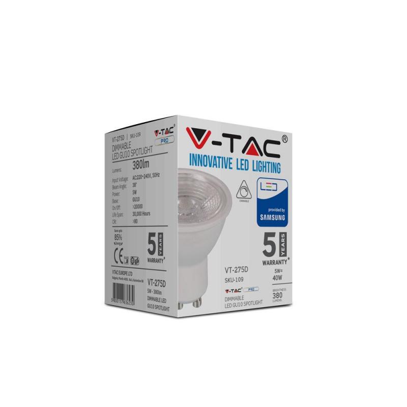 Żarówka LED V-TAC VT-275D Samsung Chip 5W GU10 6400K 380lm A+ 38°